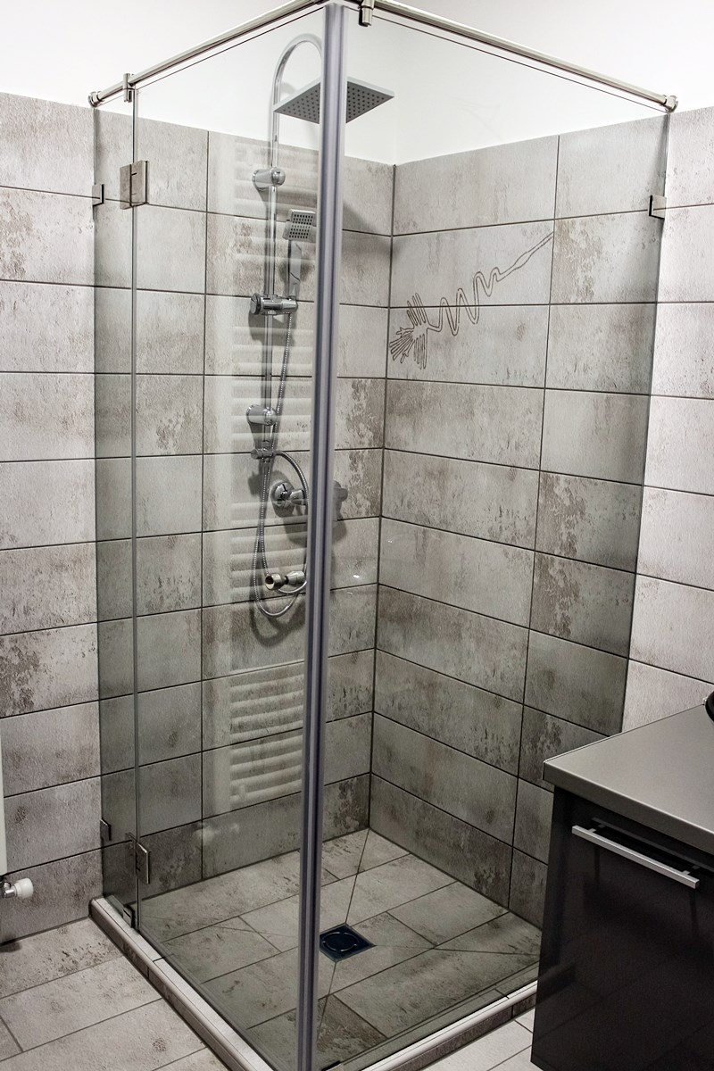 Das Badezimmer verfügt über ein eingebautes Waschbecken und einen Schrank. Es ist mit einer speziell angefertigten Glaswanddusche mit Klud-Wasserhahn, einer Regendusche und einem Heizkörper mit Handtuchtrockner ausgestattet. Die Toilette wird in einem separaten Raum eingerichtet. Im Wohnzimmer der Wohnung gibt es eine Kühl-Heiz-Klimaanlage.