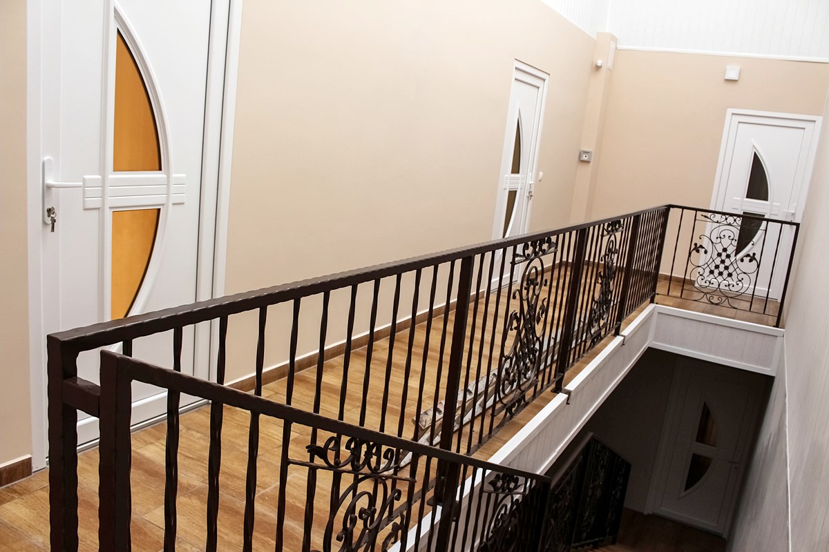 Die einzigartige Atmosphäre des Treppenhauses wird durch ein schmiedeeisernes Treppengeländer besonders hervorgehoben.